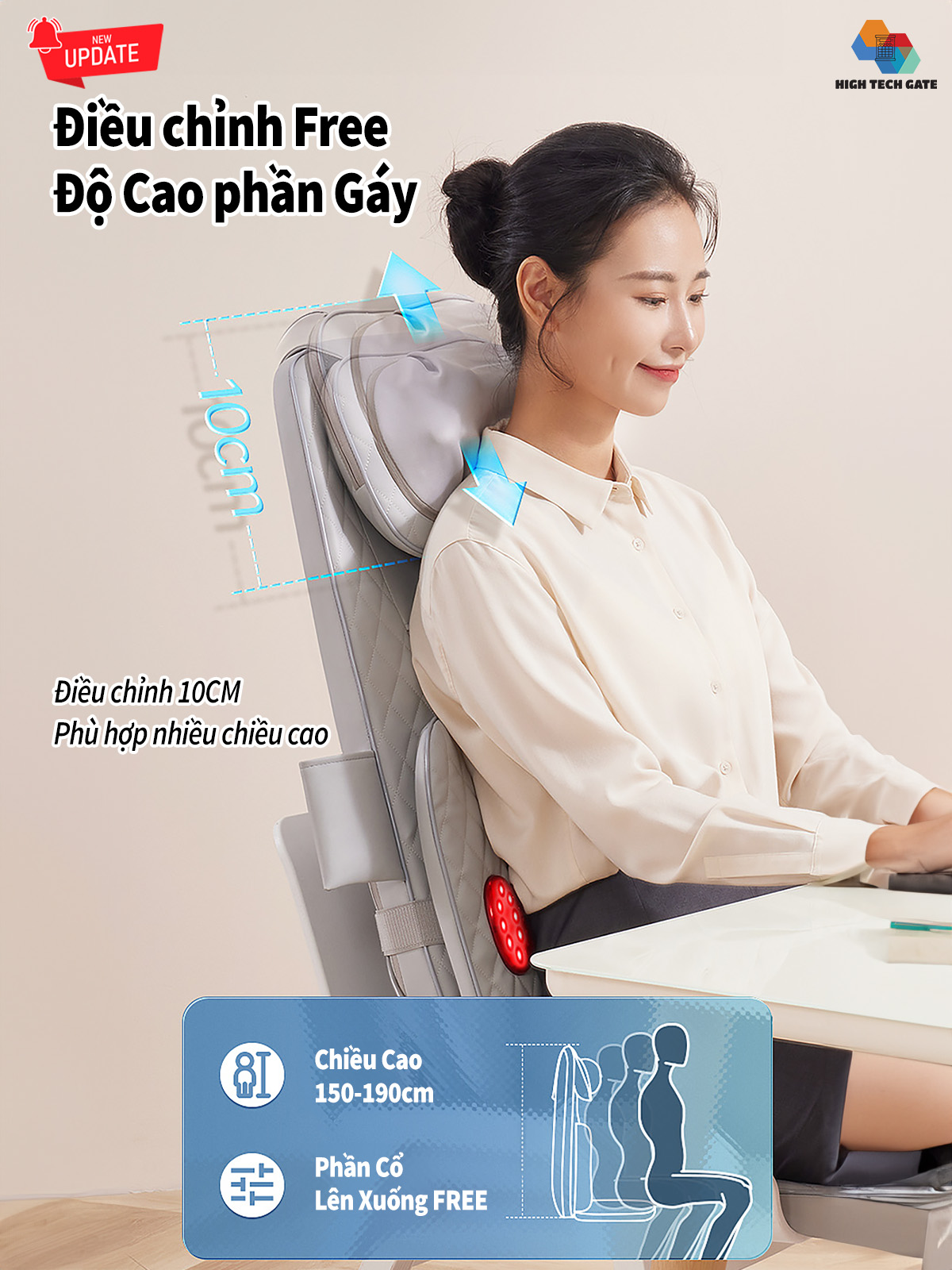 • Với thiết kế nâng cấp vùng massage Cổ Vai được tháo rời tách biệt, khác với các phiên bản thông thường, có thể điều chỉnh lên đến 10cm, giúp massase xoa bóp sâu hơn vùng Cổ và Vai, nâng cao trải nghiệm tốt hơn cho người dùng. Ngoài ra với vùng lưng, các đầu massage được thiết kế hình chữ S, giúp đốt sống lưng được bo sát, giảm thiểu các lực lên phần lưng nhanh chóng, thư giãn các cơ lưng và eo một cách hiệu quả