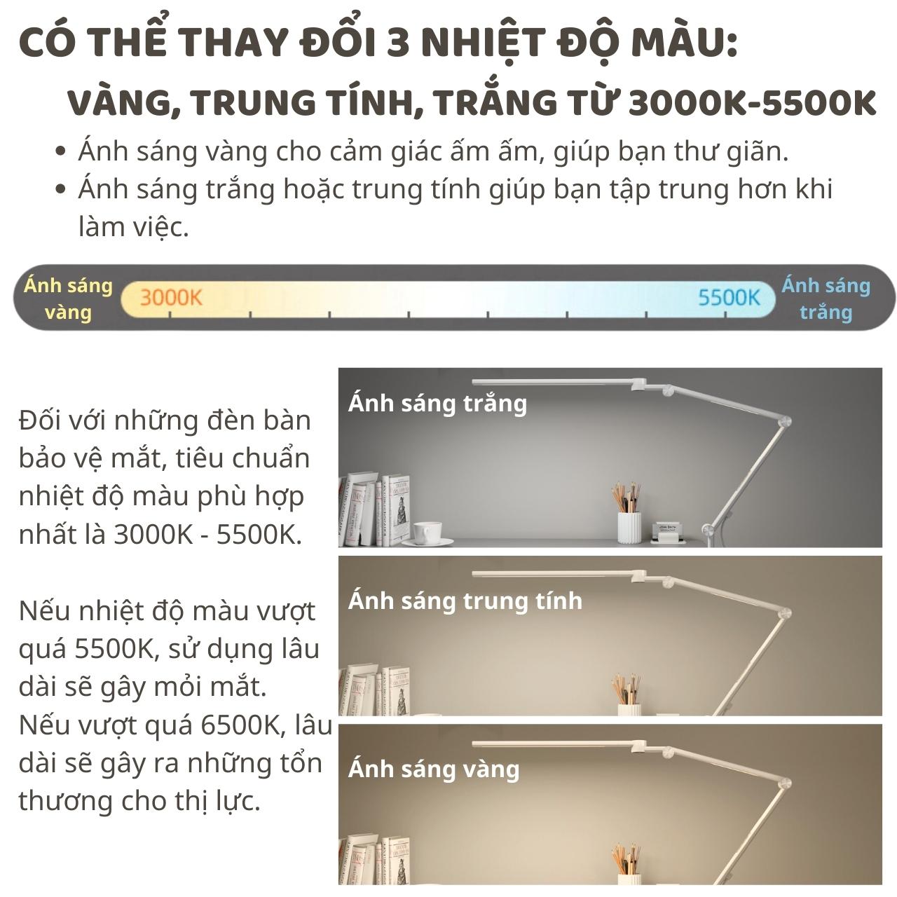 - 3 chế độ màu: ánh sáng vàng, trung tính, trắng
