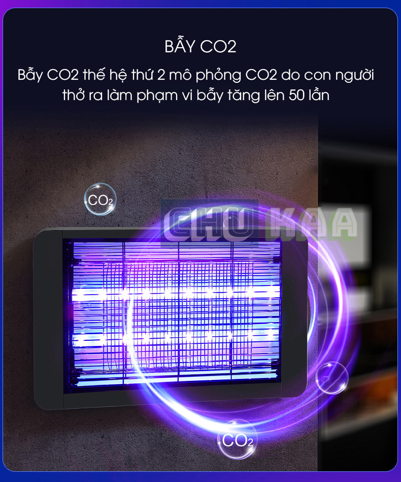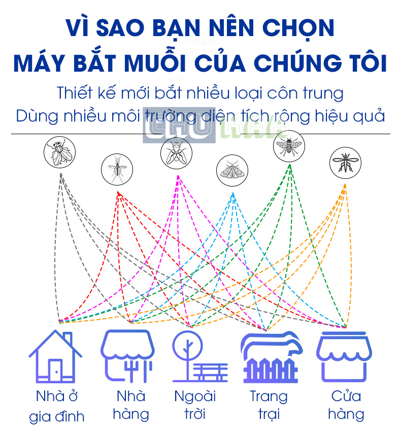 Sử dụng bóng đèn chuyên dụng phát tia UVA thu hút côn trùng và bị tiêu diệt bằng lưới điện. An toàn, tiện lợi, không gây hại cho sức khỏe cho người tiêu dùng và