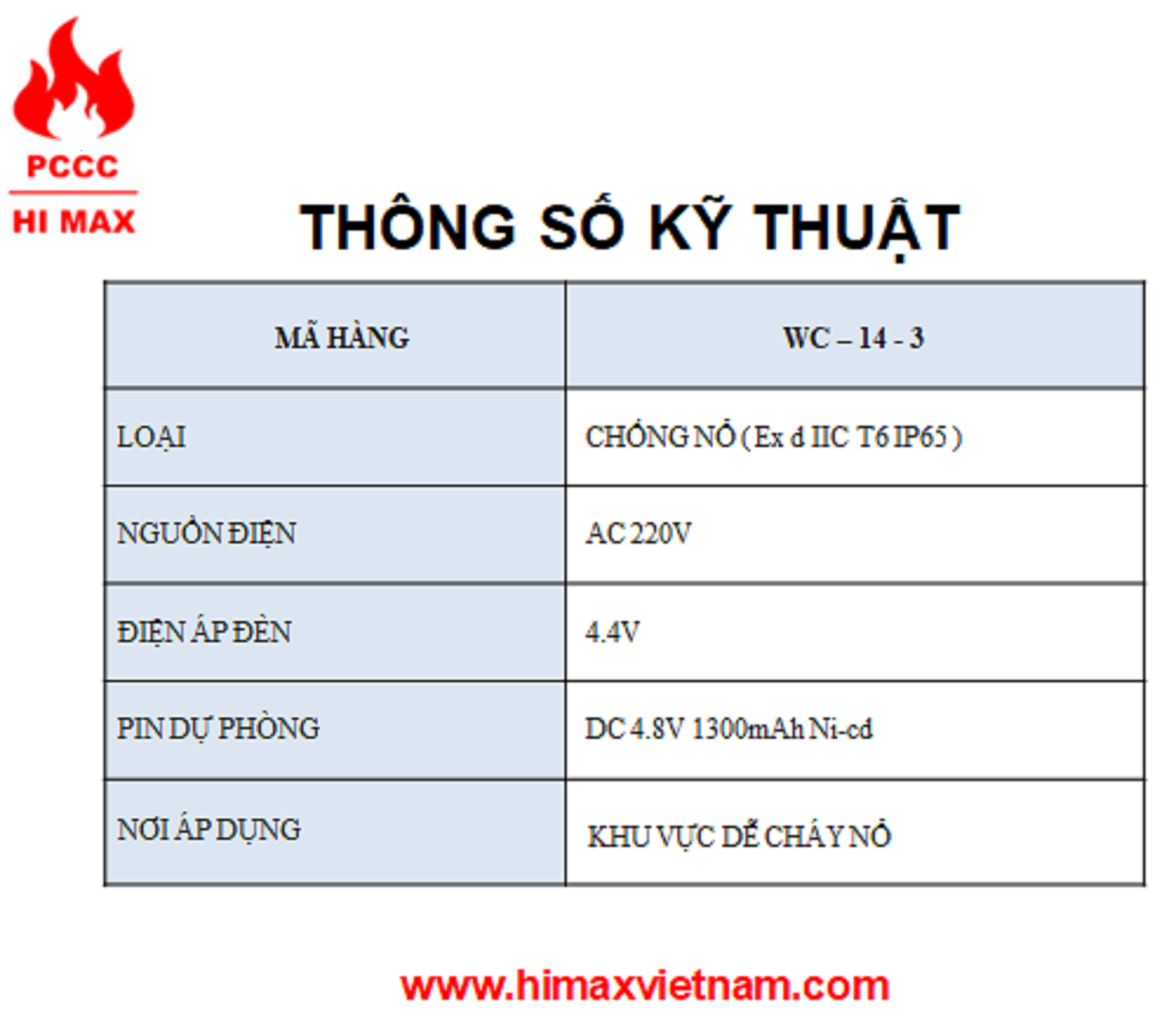 MÃ HÀNG: WC-14-3 LOẠI: CHỐNG NỔ ( Ex d IIC T6 IP65 ) NGUỒN ĐIỆN: AC 220V ĐIỆN ÁP ĐÈN: 4.4V PIN DỰ PHÒNG: DC 4.8V, 1300mAh Ni-Cd NƠI ÁP DỤNG: KHU VỰC DỄ CHÁY NỔ