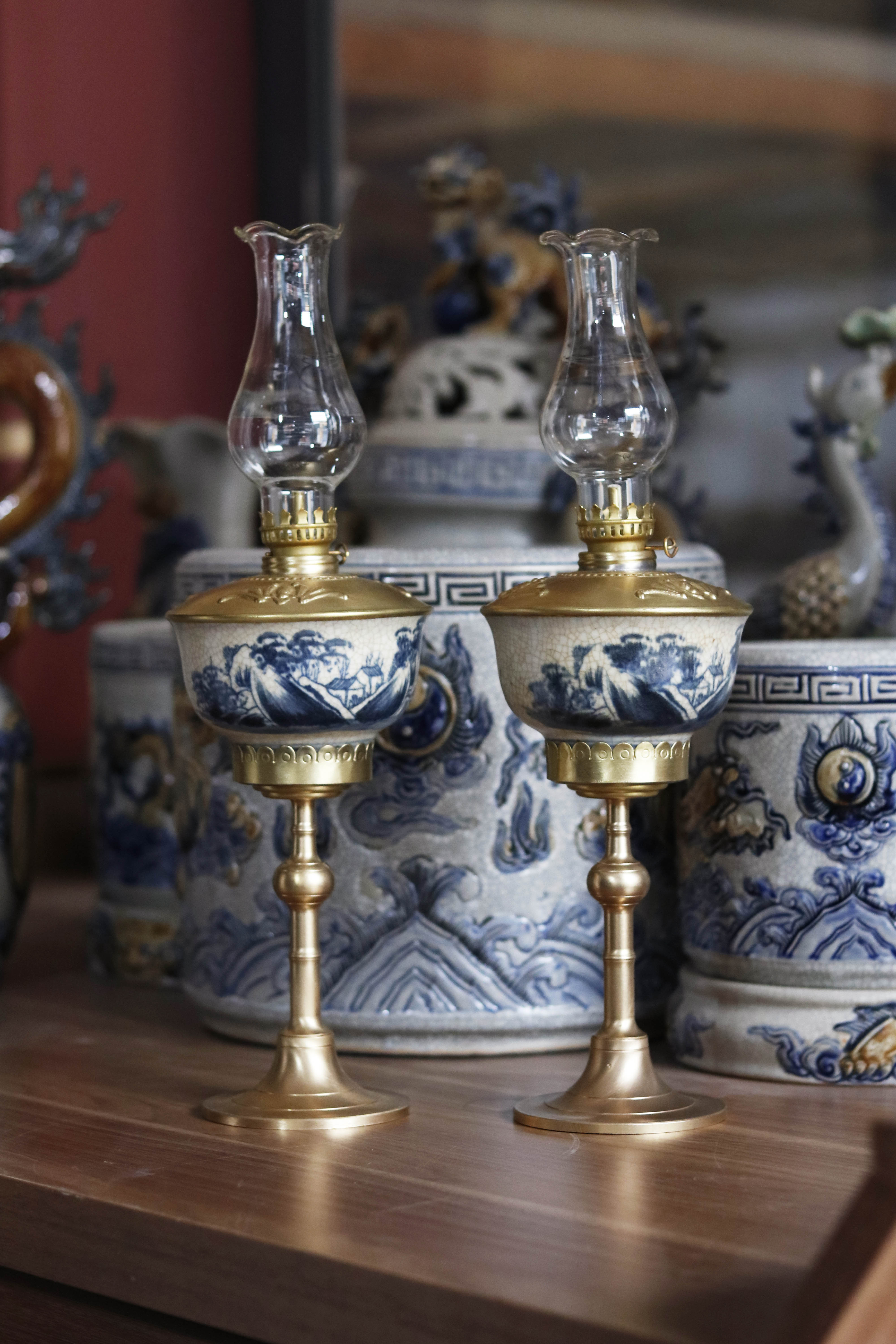 Cặp đèn dầu gốm men rạn bọc đồng cực sang trọng