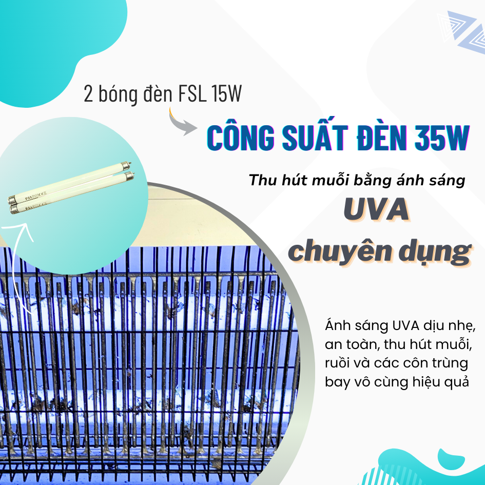 Sử dụng bóng đèn chuyên dụng phát tia UVA thu hút côn trùng và bị tiêu diệt bằng lưới điện. An toàn, tiện lợi, không gây hại cho sức khỏe cho người tiêu dùng và