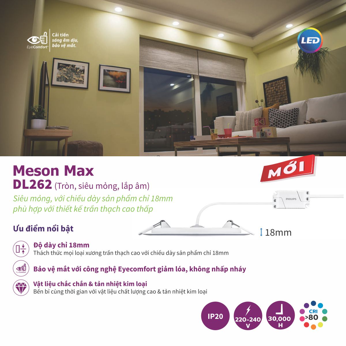Bộ đèn LED Downlight âm trần Meson Max DL262 là dòng sản phẩm thiết kế siêu mỏng chỉ 18mm, thân đèn bằng kim loại chắc chắn và tuổi thọ lên đến 30,000 Giờ giúp vận hành bền bỉ theo thời gian.