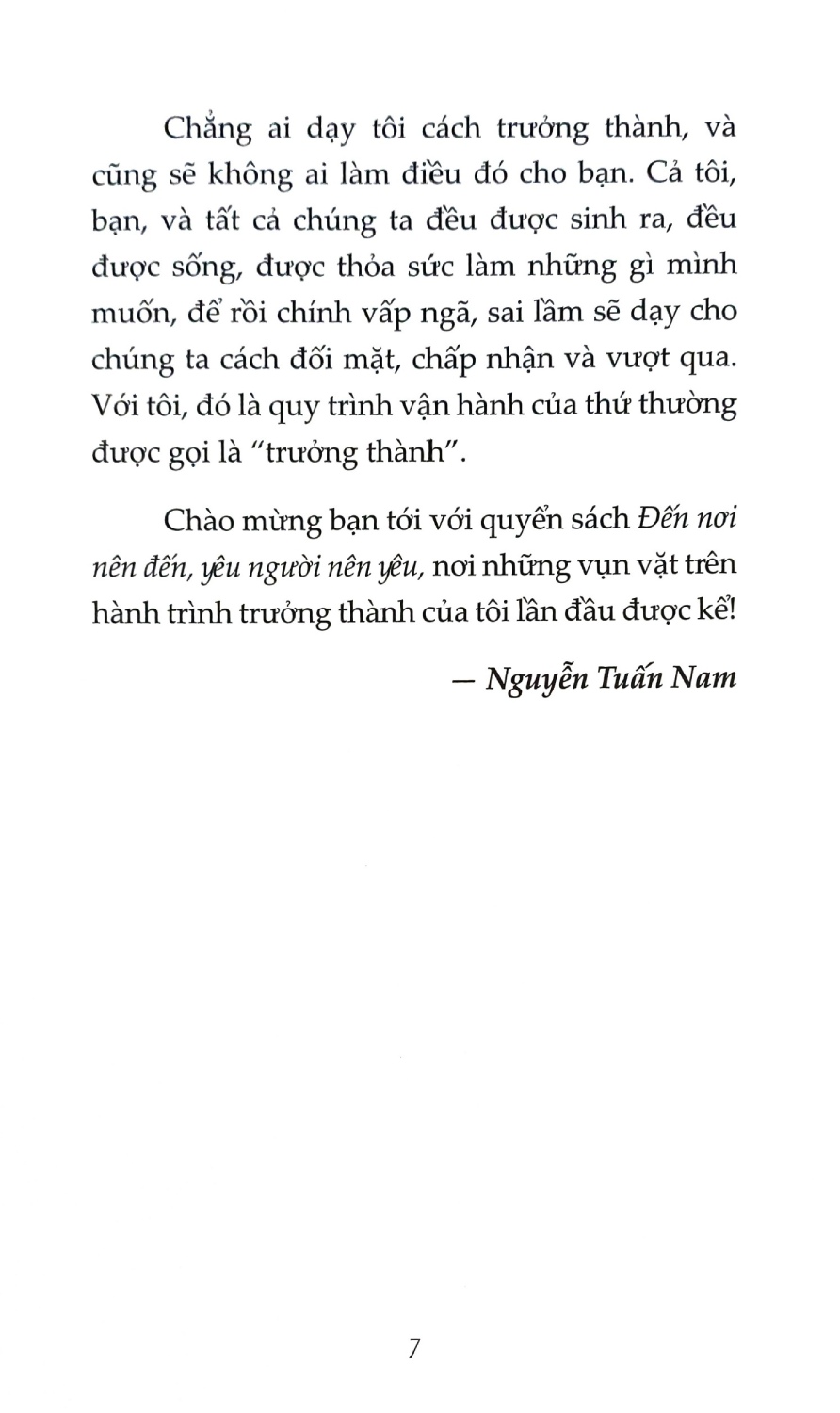 Đến Nơi Nên Đến, Yêu Người Nên Yêu là câu chuyện về những ngày như thế, những ngày đẹp nhất của tuổi 20, khủng hoảng ở ngưỡng cửa 1/4 cuộc đời và cảm xúc hoang mang song cũng vô cùng tận hưởng khi chạm mốc 30 của tác giả Nguyễn Tuấn Nam và Phan Quốc Dũng. Bằng sự sẻ chia chân thành, những trang viết trong cuốn sách như từng trang lưu bút của tuổi trẻ, mang chút vị đắng của những bài học chốn công sở, vị ngọt ngào của và cả vị mặn của biết bao giọt nước mắt hạnh phúc khi vượt qua khó khăn. Cuốn sách giúp bạn rời khỏi vỏ bọc xù xì, để tự do ôm ấp những vỡ vụn và tan chảy trong niềm hạnh phúc khi ở bên những người thân thiết.