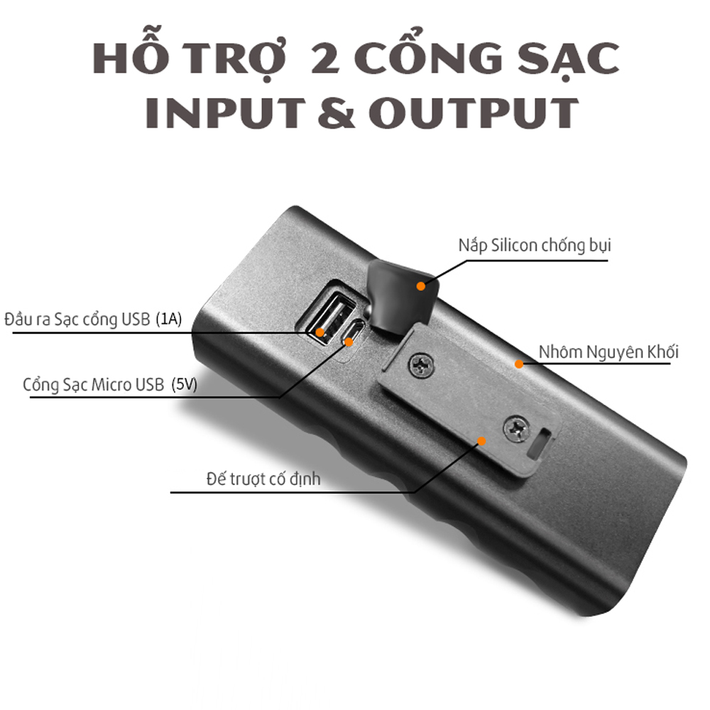 Tích hợp 2 viên pin sạc 18650 dung lượng lớn cho thời gian sử dụng liên tục gần đến 5h với độ sáng mạnh