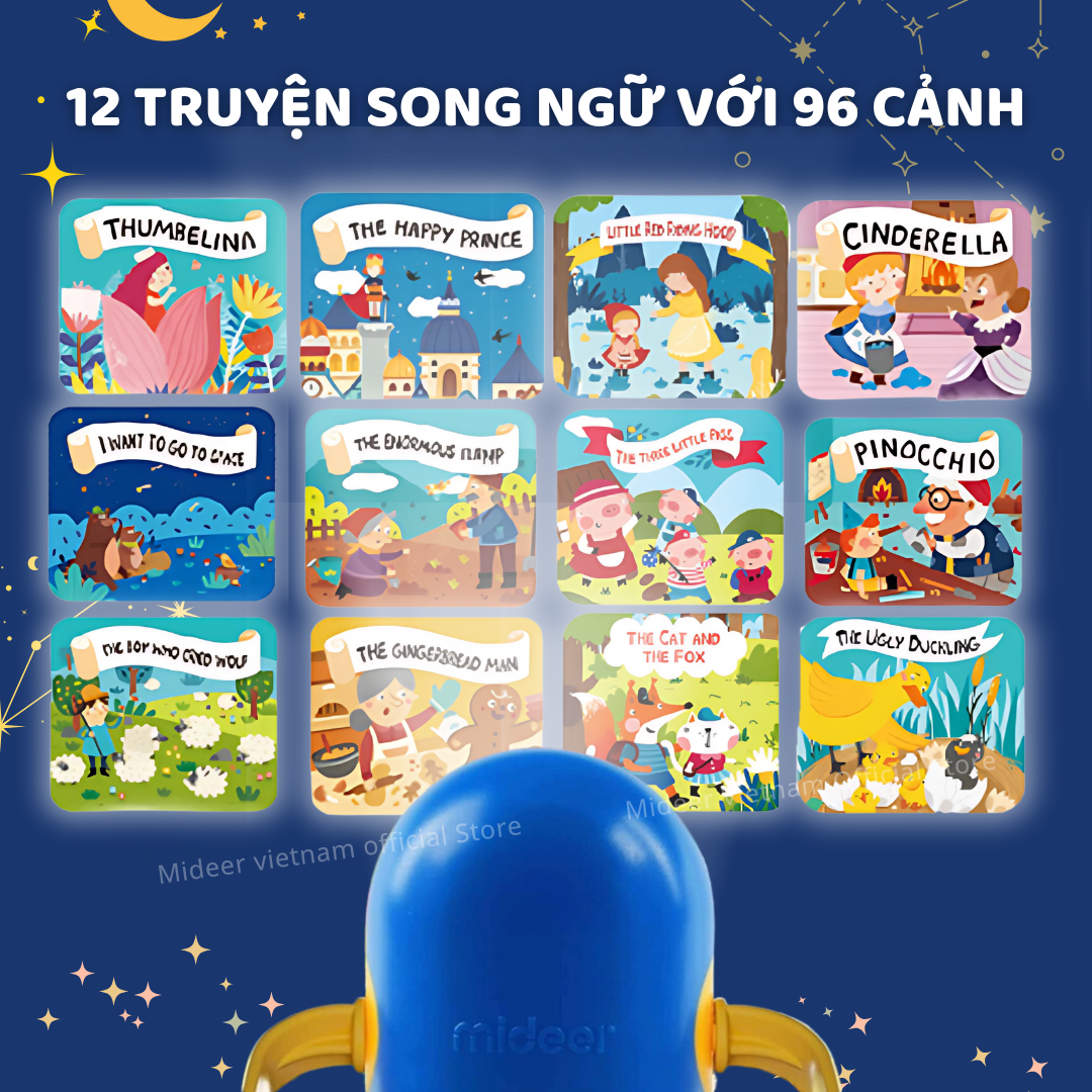 - NÚT BẤM VỚI 3 CHỨC NĂNG Nhấn một lần: Chiếu phim Nhấn hai lần: Đèn ngủ Nhấn ba lần: Tắt đèn 9. 12 CÂU CHUYỆN VỚI 96 CẢNH PHIM
