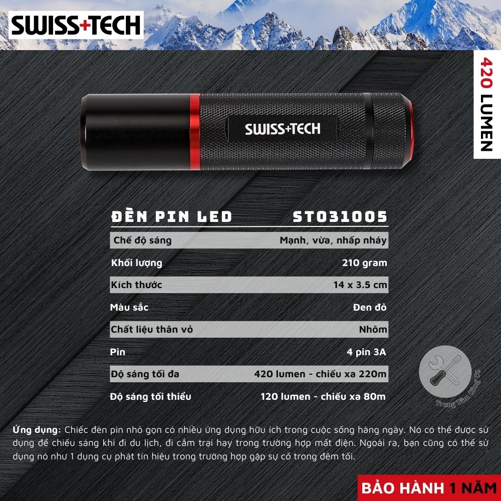 - Độ Sáng 300 Lumen: SWISS+TECH ST031005 cung cấp nguồn ánh sáng mạnh mẽ với độ sáng lên đến 420 lumen, giúp chiếu sáng mọi góc tối trong các cuộc phiêu lưu của bạn.