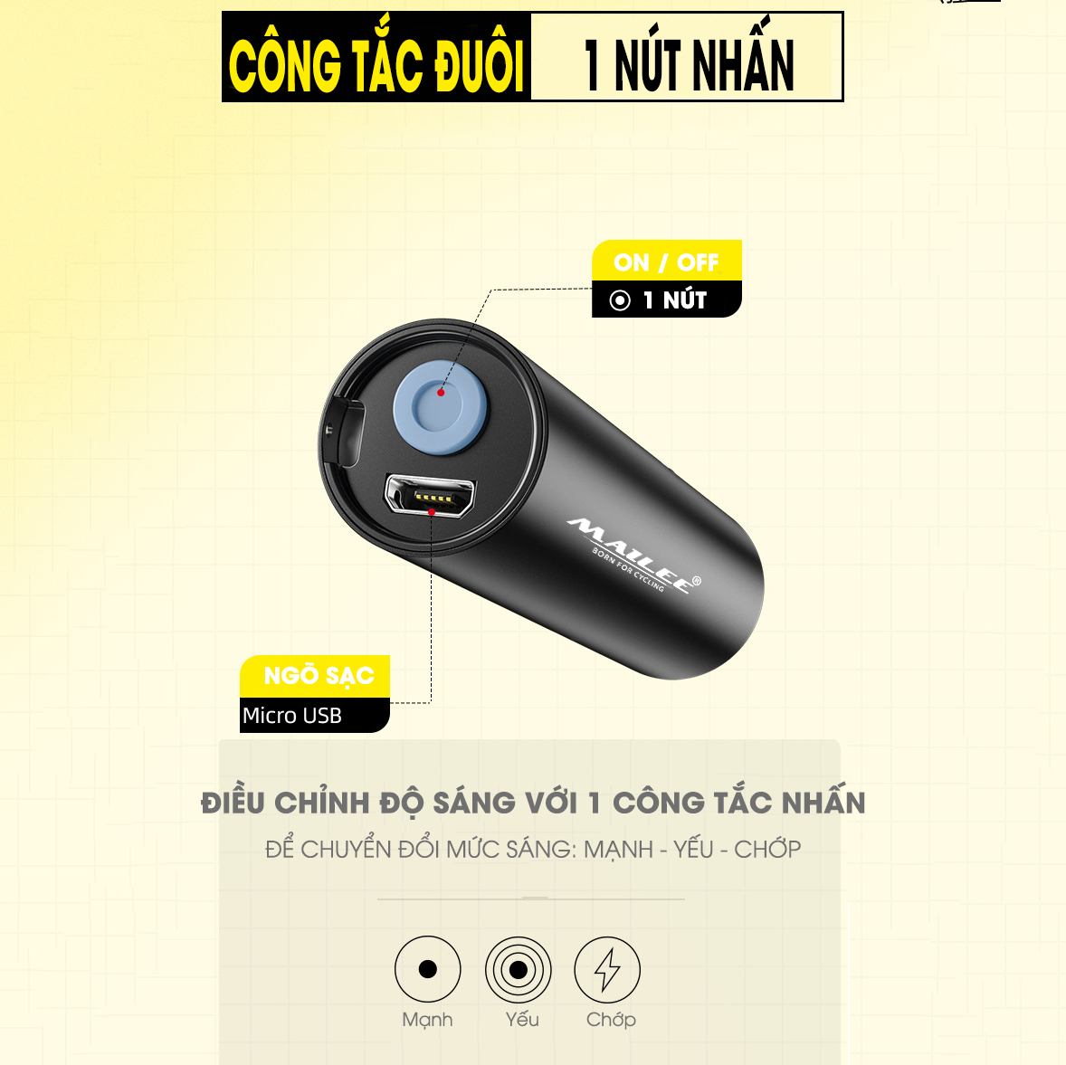 Mua tại TiktokĐèn Pin Led Mini MAILEE D02-mini cho xe đạp Có Sạc USB bóng Led XPE 3W 350lumens (không zoom) nhỏ gọn bỏ túi (không kèm chân đế)