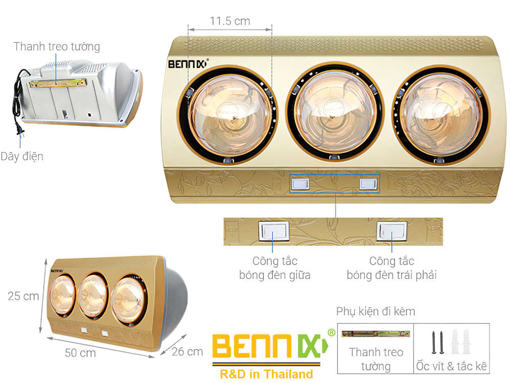 Đèn sưởi nhà tắm 3 bóng Bennix Thái Lan BN-3G bảo hành 36 tháng