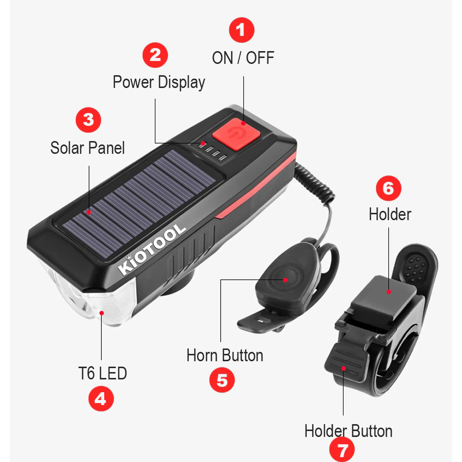 ✨Đèn xe đạp năng lượng mặt trời Kiotool có còi chống nước 3 chế độ sáng
