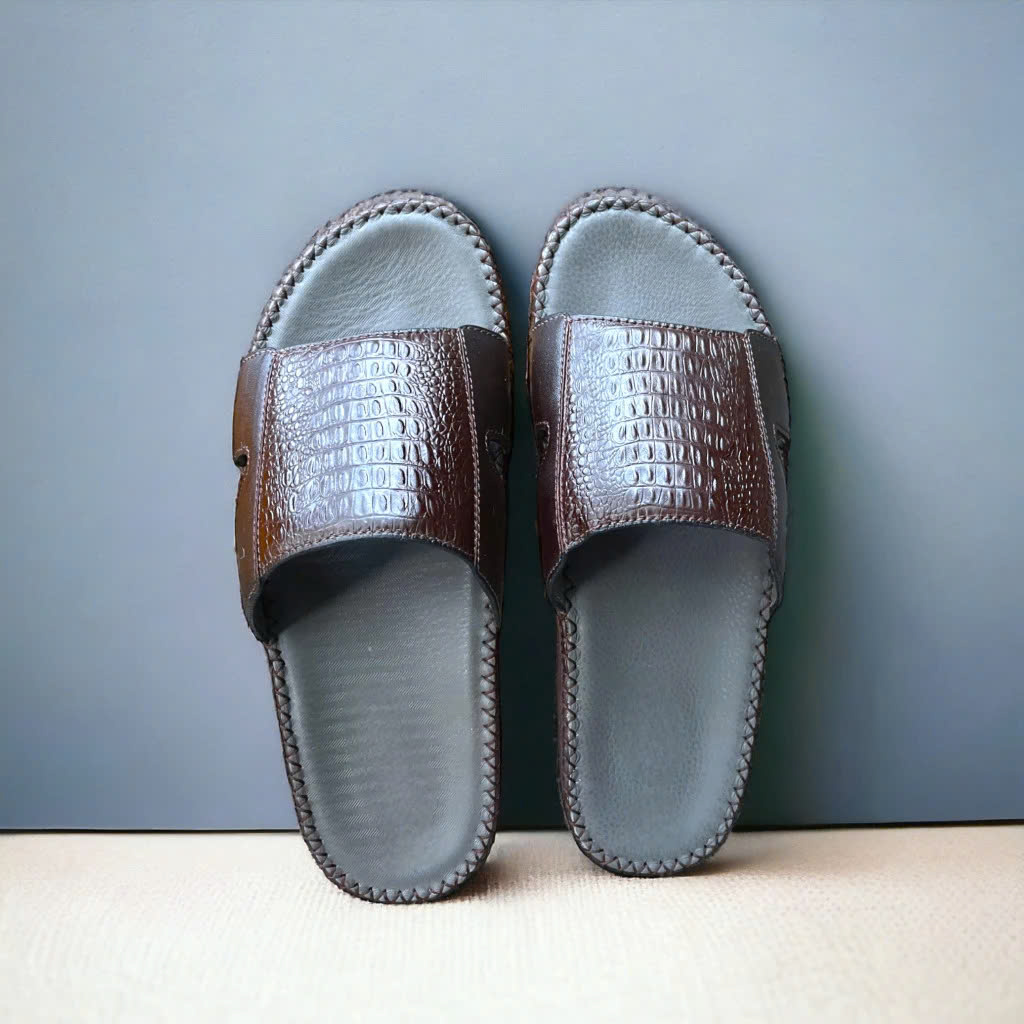 Mô tả: Tên sản phẩm: Dép nam quai ngang da cá sấu đế cao 3cm 2 loại móng, trơn 2 màu nâu đen DCS200 Chất liệu: Chất liệu da cá sấu có móng và loại