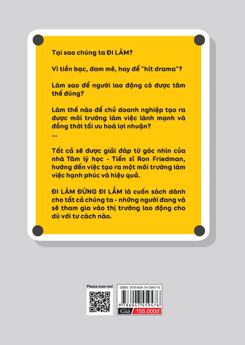 Đi Làm Đừng Đi Lầm Tại sao chúng ta phải ĐI LÀM? Vì tiền bạc, vì đam mê hay đơn giản chỉ là hít “drama”, đủ thứ chuyện trên giời dưới biển. Làm sao để người lao động có được tâm thế đúng? Làm thế nào để chủ doanh nghiệp tạo ra được môi trường làm việc lành mạnh và đồng thời tối ưu hóa được lợi nhuận? Tất cả sẽ được giải đáp từ góc nhìn của nhà Tâm lý học – Tiến sĩ Ron Friedman hướng đến việc tạo ra một môi trường làm việc hạnh phúc và hiệu quả. ĐI LÀM ĐỪNG ĐI LẦM là cuốn sách dành cho tất cả chúng ta – những người đang và sẽ tham gia vào thị trường lao động cho dù với tư cách nào đi chăng nữa.