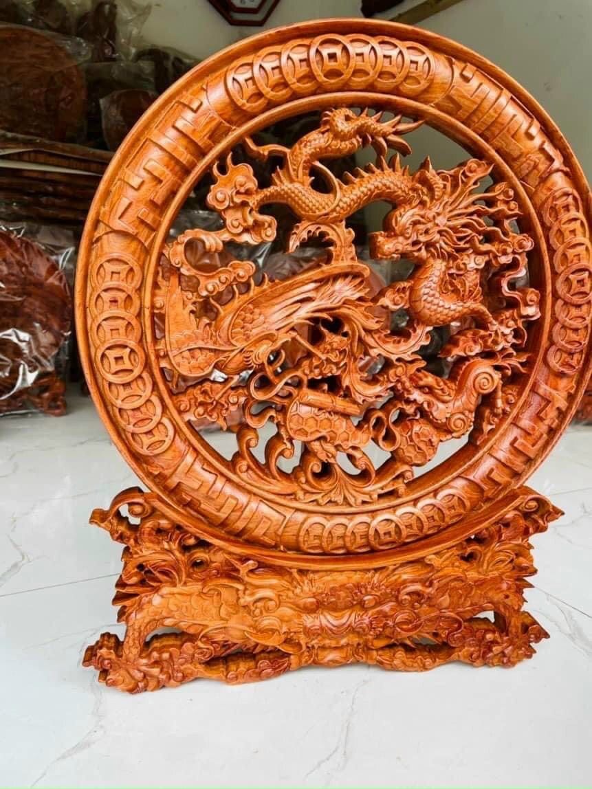 ✨Đĩa trạm khắc tứ linh trang trí phong thủy bằng gỗ hương đá kt mặt tròn 40×4cm