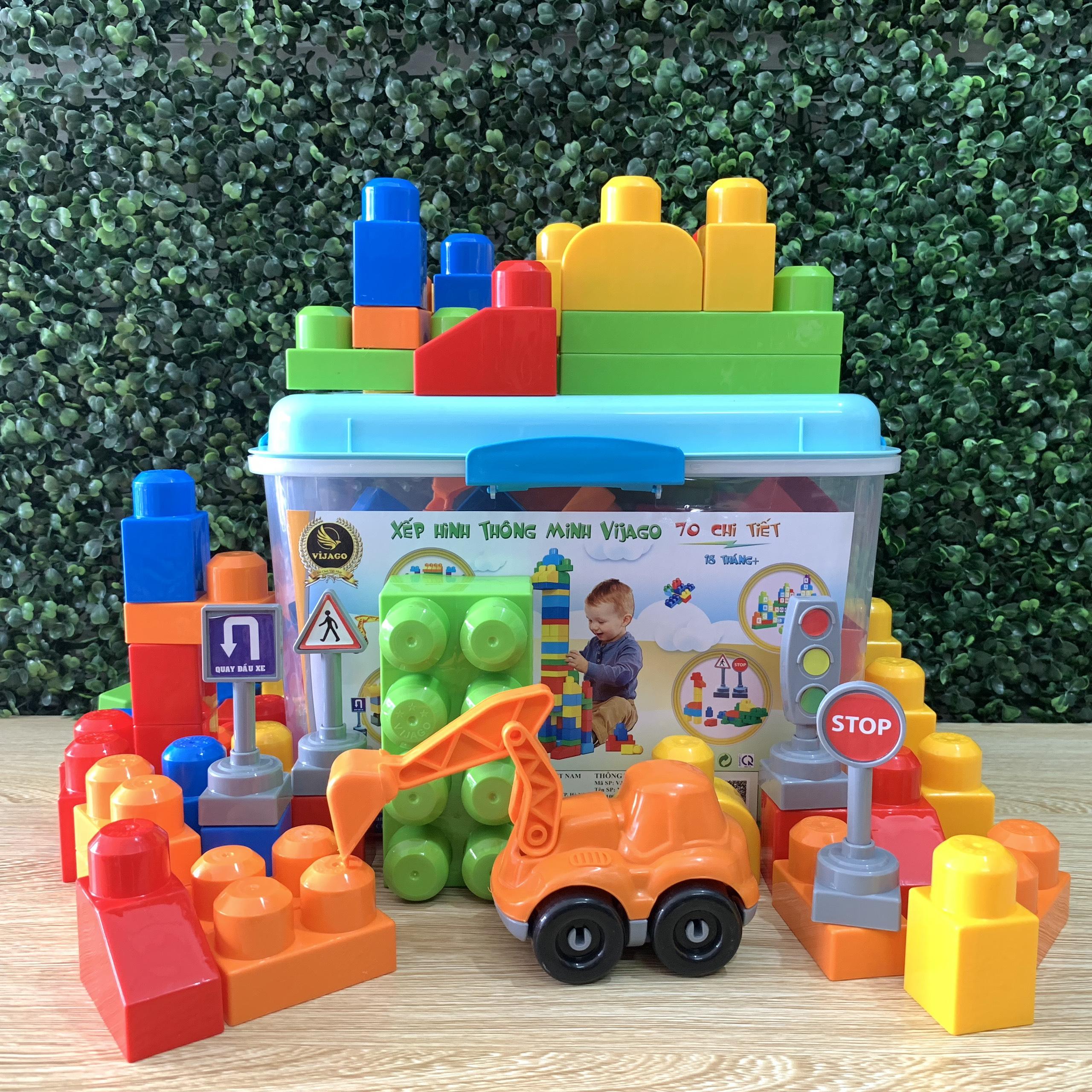 ✨Đồ Chơi Bộ Xếp Hình Thông Minh Vijago 70 Miếng Ghép Cỡ Lớn Màu Sắc Bắt Mắt, Có Kèm Ô Tô Múc Và Hộp Đựng Tiện Lợi Cho Bé Để Gọn Gàng