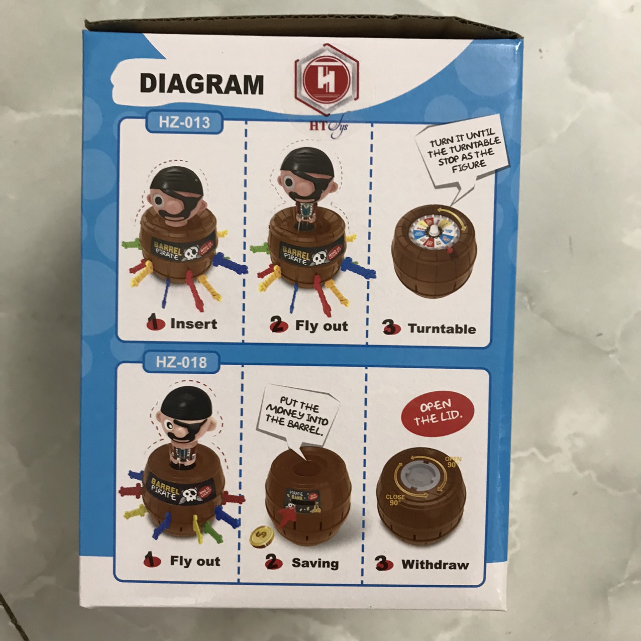 - 1 thùng lớn để hải tặc ngồi bên trong với các lỗ nhét kiếm xung quanh. CÁCH CHƠI: Quy định luật chơi người đâm trúng hải tặc là người thắng hoặc thua
