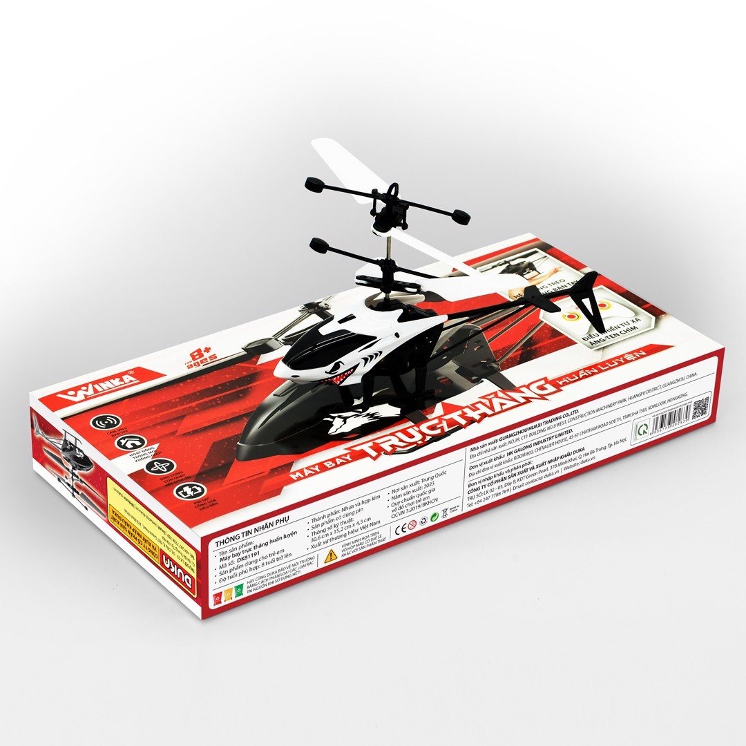 Máy bay điều khiển từ xa - Trực thăng huấn luyện, DK81191     Được thiết kế giống với mô hình máy bay trực thăng huấn luyện trong quân sự , với các chức năng: bay thẳng lên - hạ xuống và bay ngang theo điều khiển từ xa, cảm ứng bàn tay , các bé sẽ nhanh chóng nhập vai trở thành một phi công điều khiển chiếc máy bay chiến đấu bảo vệ tổ quốc. Quá trình chơi với các bạn giúp bé học được nhiều điều bổ ích, đồng thời kích thích phát triển toàn diện các kỹ năng xử lý tình huống.     Việc điều khiển máy bay giúp bé dần hình thành kỹ năng quan sát cho bé nhờ việc bé quan sát chuyển động của đồ chơi hình dạng và màu sắc của chúng.     Sản phẩm không những mang đến cho bé những giây phút vui chơi thật thoải mái và vui vẻ bên bạn bè và gia đình mà còn giúp bé phát triển và hoàn thiện các kỹ năng và giác quan.