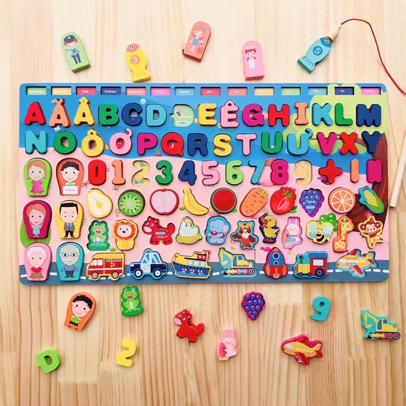 Bảng Đồ Chơi Thông Minh Cho Bé 2-6 tuổi Học Chữ cái , Số Đếm , Câu Cá 7in1 Bằng Gỗ An Toàn