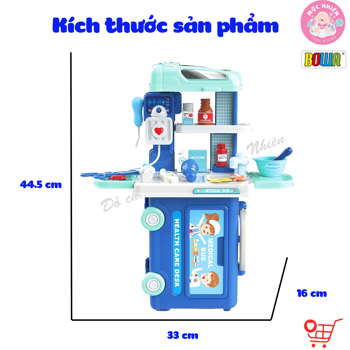 - Bộ sản phẩm đồ chơi nhập vai BOWA 8074 – Xe buýt y tế 29 chi tiết với các dụng cụ y tế được mô phỏng đa dạng như êm, đèn pin, máy đo nhịp tim, nhiệt kế giúp bé thỏa thích nhập vai làm anh bác sỹ hay cô y tá thực thụ. Đặc biệt thiết kế có thể biến đổi thành 1 trong 3 kiểu dáng gồm kệ đứng, kệ để bàn và xe buýt y tế có bánh xe đẩy được sẽ rất thú vị cho bé chơi mỗi ngày, giả định vào nhiều tình huống khác nhau.