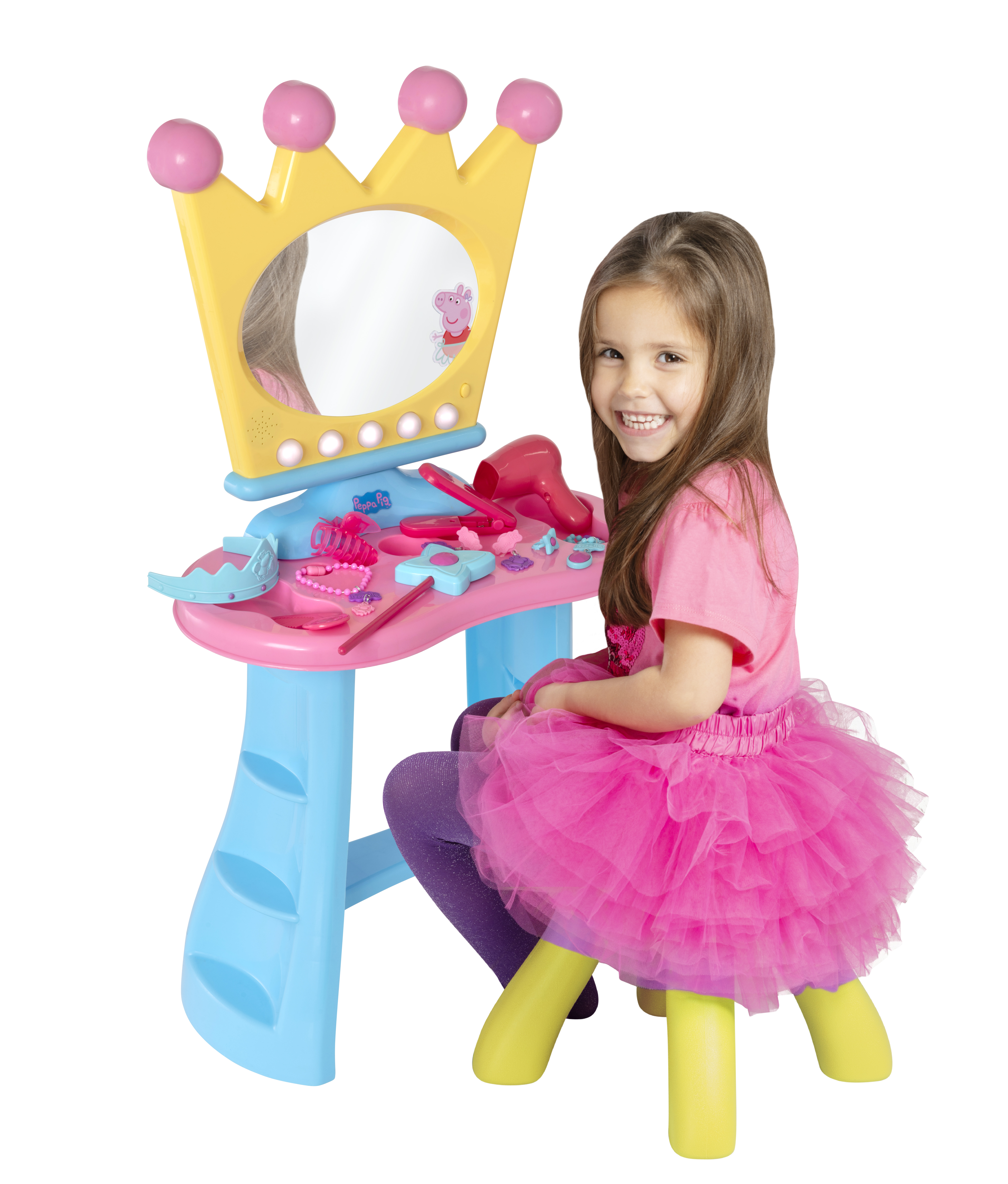 - Chiếc bàn xinh xắn với màu sắc vàng xanh với gương phát sáng hình vương miện. Ấn nút! Giai điệu Peppa Pig quen thuộc cất lên!
