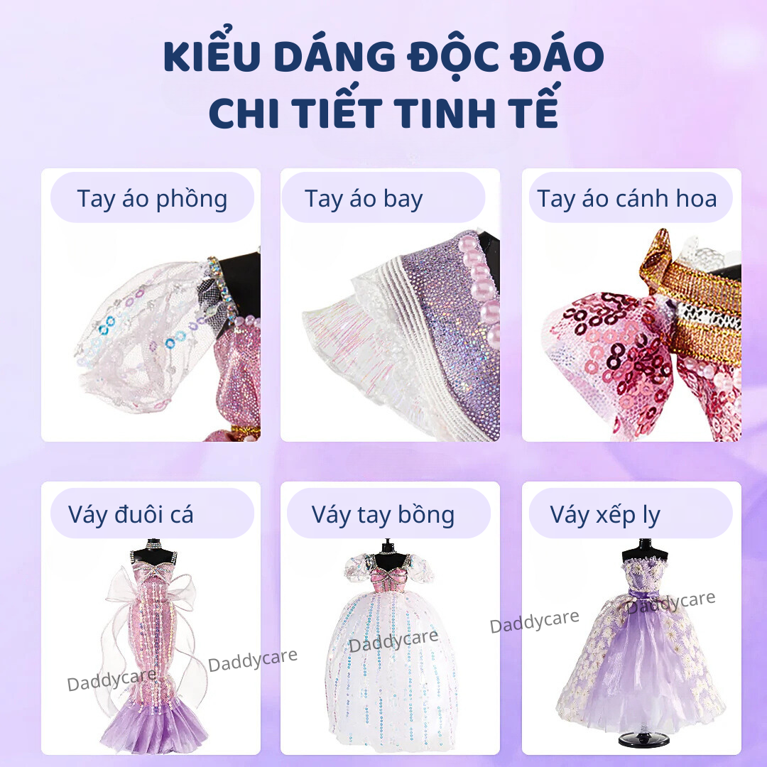 - Các kiểu dáng dộc dáo và chi tiết tinh tế: Bộ sản phẩm có các kiểu dáng tay áo và váy khác nhau như tay áo phồng, tay áo cánh hoa, váy đuôi cá, váy xếp ly… giúp bé sáng tạo những trang phục mang nét đẹp tinh tế và cuốn hút.