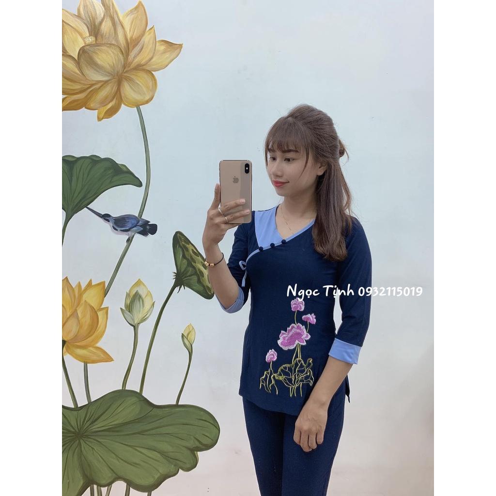 Đồ lam đi chùa - Quần áo đi chùa - Đồ lam phật tử - Bộ đồ đi lễ chùa thêu sen cổ tàu (Ảnh + Video shop tự quay) Bộ đồ lam phật tử