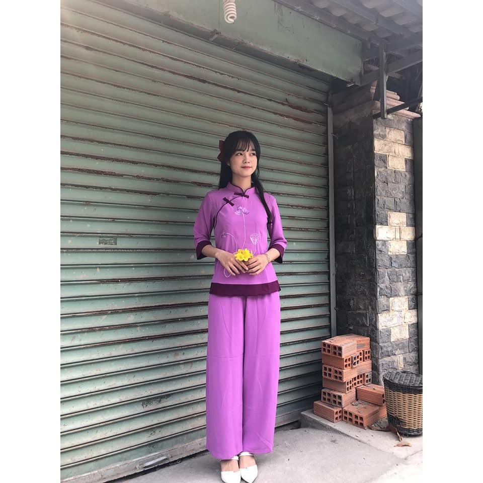 Mẫu pháp phục nữ - quần áo Phật tử đi chùa, đồ lam chất kate lụa mềm có co giãn Sen Hồng 0898553583