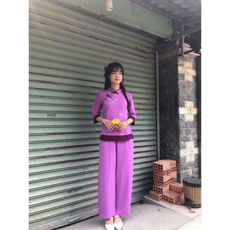 quần áo Phật tử cổ tàu cài chéo - đồ lam đi chùa Sen Hồng - set Phật tử nữ đẹp 0898553583