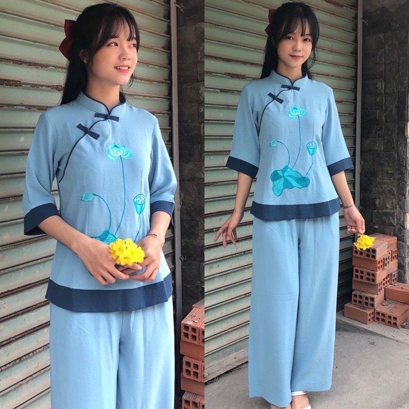 Đồ lam đi chùa - áo xống đi chùa - Đồ lam phật tử - Bộ đồ đi lễ chùa thêu sen cổ tàu (Ảnh + Video cửa hàng tự quay) Bộ đồ lam phật