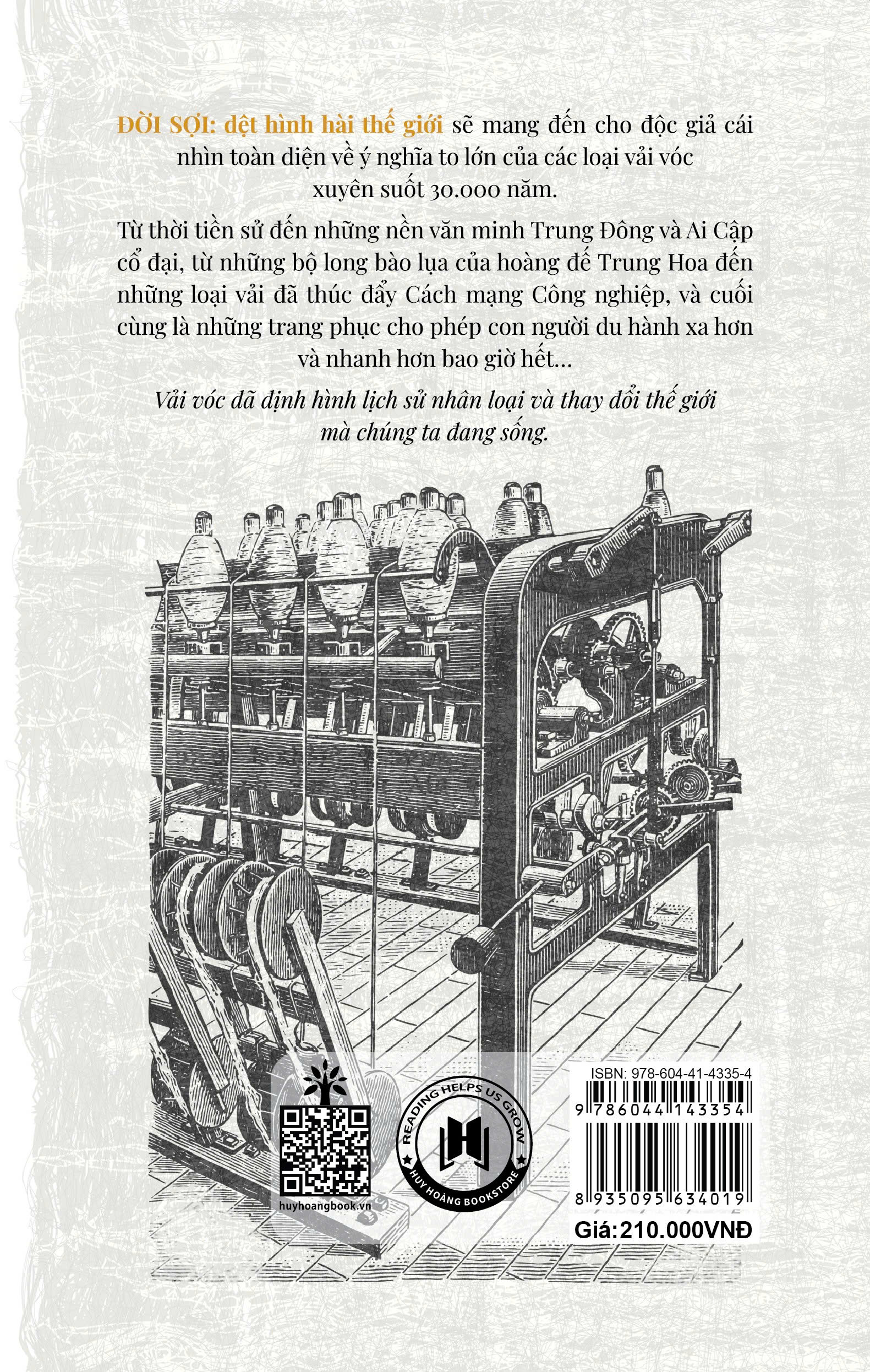 "Cuốn sách chứa đựng 13 câu chuyện khác nhau giúp minh họa ý nghĩa to lớn của các loại vải vóc xuyên suốt 30.000 năm lịch sử: từ thời tiền sử đến những nền văn minh ở Trung Đông và Ai Cập cổ đại; qua những bộ long bào bằng lụa của các hoàng đế Trung Quốc đến những loại vải đã thúc đẩy Cách mạng Công nghiệp và cuối cùng đến những loại vải được tổng hợp trong phòng thí nghiệm, thứ cho phép con người đi xa hơn và nhanh hơn bao giờ hết. Vải vóc đã mang lại sự ấm áp và sự bảo vệ, giúp phân biệt địa vị, tạo nên bản sắc cá nhân cũng như cung cấp một phương tiện cho sự sáng tạo. Vải đã thay đổi, định nghĩa, phát triển và định hình thế giới mà chúng ta đang sống. "