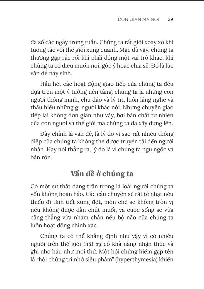 Trong một thế giới không ngừng “dội bom” chúng ta với hàng triệu thông tin mỗi ngày, sự đơn giản chính là chìa khóa để thông điệp của bạn không bị hòa lẫn trong ma trận đó. Mở đầu cuốn sách, Guttmann chia sẻ một số kiến thức cơ bản để giúp chúng ta hiểu rằng bộ não con người rất dễ bị quá tải khi đón nhận nhiều thông tin và yếu tố kích thích. Những thông điệp phức tạp không chỉ khó kết nối với não bộ mà còn thường khiến bộ não bối rối, áp lực và kém tập trung. Ngược lại, thông điệp đơn giản sẽ nổi bật vì chúng dễ hiểu, dễ nhớ và dễ phản ứng.
