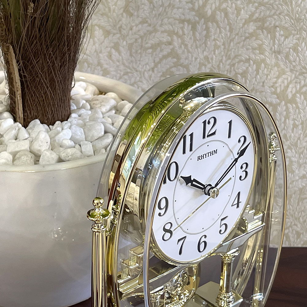 Đồng hồ để bàn Nhật Bản Rhythm 4RP796WS18, dùng pin (AAx2), vỏ nhựa cao cấp mạ vàng kết hợp mica trong suốt nhìn xuyên thấu, Kích thước 14.0 x 22.8 x 8.3cm, trọng lượng 390g. Quả
