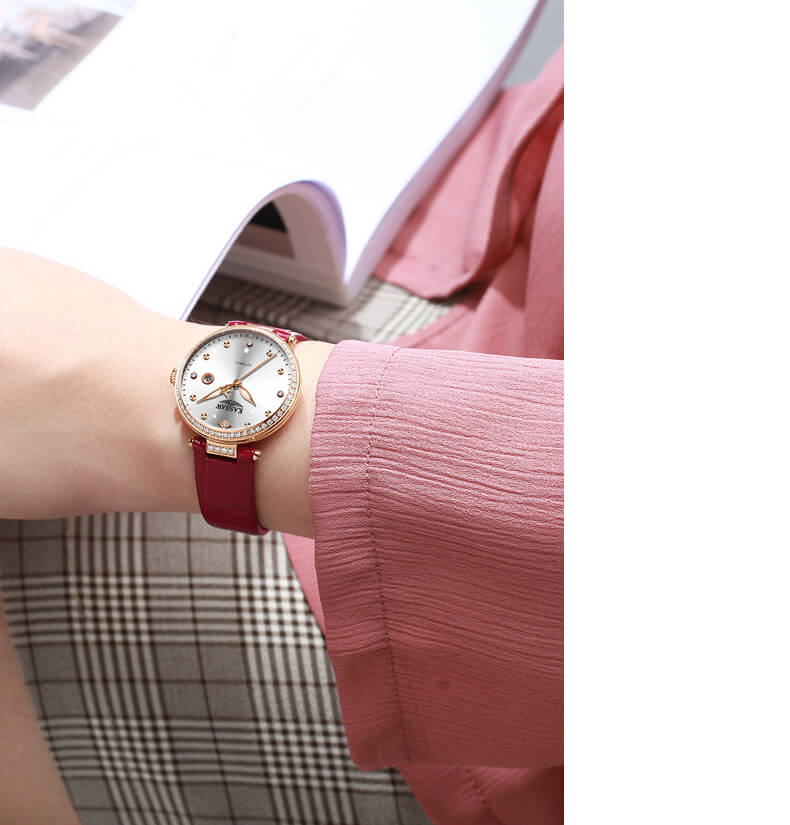 THÔNG SỐ  SẢN PHẨM: Thương hiệu :Kassaw Mã sản phẩm : K990-2 Giới tính : Nữ Kiểu máy : Đồng hồ cơ (Automatic) Đường kính mặt : 33 mm Độ dày : 10 mm Chất liệu