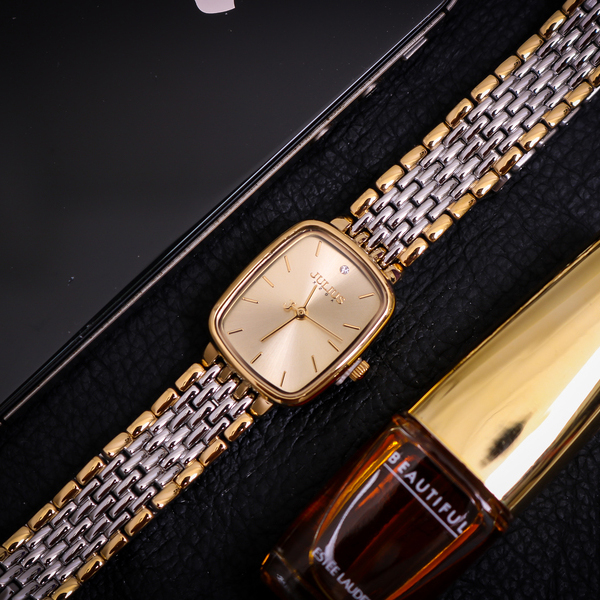 THÔNG SỐ SẢN PHẨM Thương hiệu: JULIUS Mã sản phẩm: JA-1065B (Vàng) Dành cho: Nữ giới, yêu thích thời trang và phá cá Chất liệu dây: Dây thép không gỉ Chất liệu mặt kính: Mặt kính khoáng cao cấp