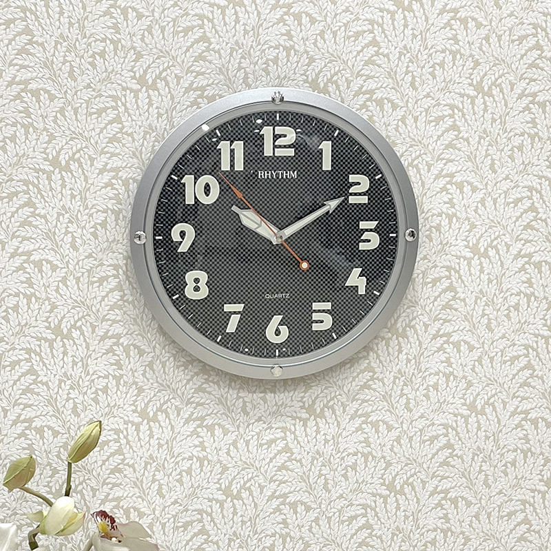 Mua tại TiktokĐồng hồ treo tường Rhythm, dùng pin (AAx1), vỏ nhựa, màu bạc Kích thước 30.6 x 4.0cm, trọng lượng 615g. Kính thuỷ tinh mo trong suốt. Mặt số dạ quang siêu sáng. Máy kim trôi chạy cực êm, chính xác, bền bỉ.