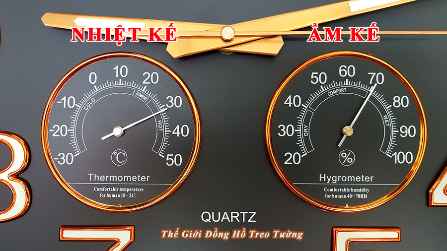(*) Nhiệt ẩm kế tự động sử dụng nguyên lý co dãn của lò so kim loại dựa trên điều kiện thời tiết để hiển thị nhiệt độ và độ ẩm xung quanh nơi treo đồng hồ. Không nên sử dụng cho mục đích khác. Đây cũng không phải là dụng cụ nhiệt ẩm kế chuyên dụng. Mức sai số của Nhiệt kế là ± 2oC. Mức sai số của Ẩm kế là ± 10%.
