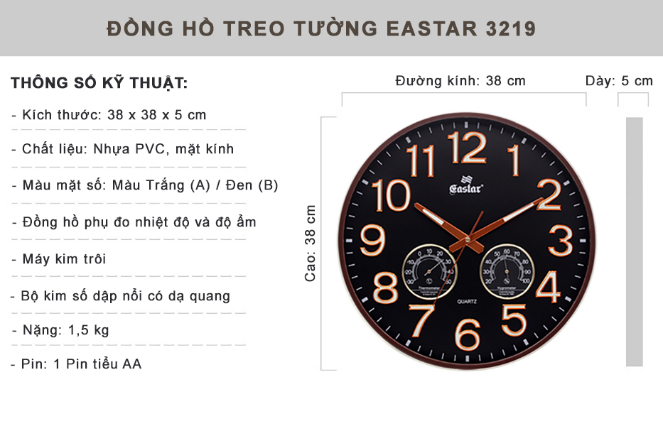 1. THÔNG TIN CHI TIẾT: - Thương hiệu: Eastar. - Loại: Máy Đồng hồ Treo tường Kim dạ quang Công nghệ Thạch anh (Quartz) chạy kim (Analogue), Loại máy đồng hồ kim trôi chạy êm