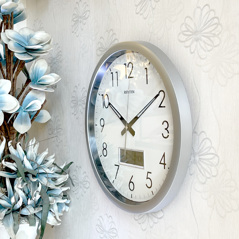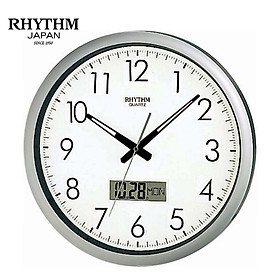 Mua tại TiktokĐồng hồ treo tường Rhythm, dùng pin (AAx2), vỏ nhựa màu bạc Kích thước 42.0 x 4.5cm, trọng lượng 1.45kg. màn hình điện tử thể hiện lịch ngày tháng thứ. Máy kim giật chạy cực êm, chính xác, bền bỉ.