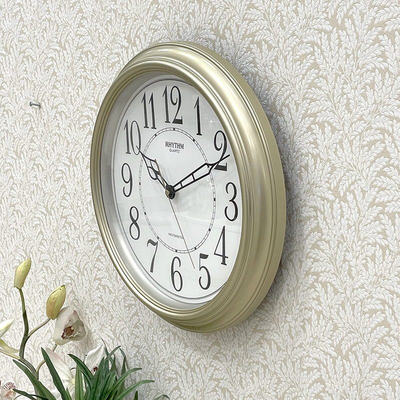 Đồng hồ treo tường Nhật Bản Rhythm CMG876NR18, dùng pin (AA x 1), vỏ nhựa màu vàng / kết hợp mạ vàng sang trọng. Kích thước 31.5 x 4.5cm, trọng lượng 625g. Máy kim trôi