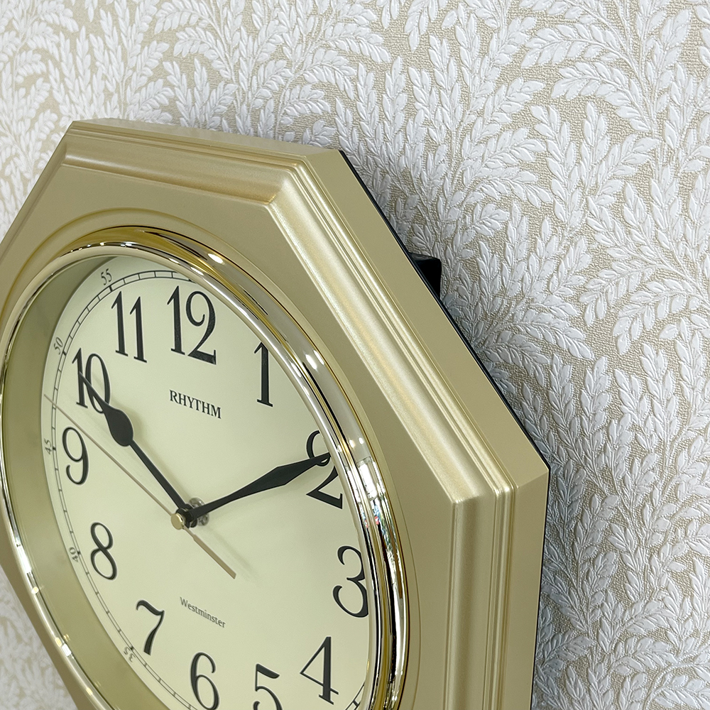 Đồng hồ treo tường Nhật Bản Rhythm CMG876NR18, dùng pin (AA x 1), vỏ nhựa màu vàng / kết hợp mạ vàng sang trọng. Kích thước 31.5 x 4.5cm, trọng lượng 625g. Máy kim trôi
