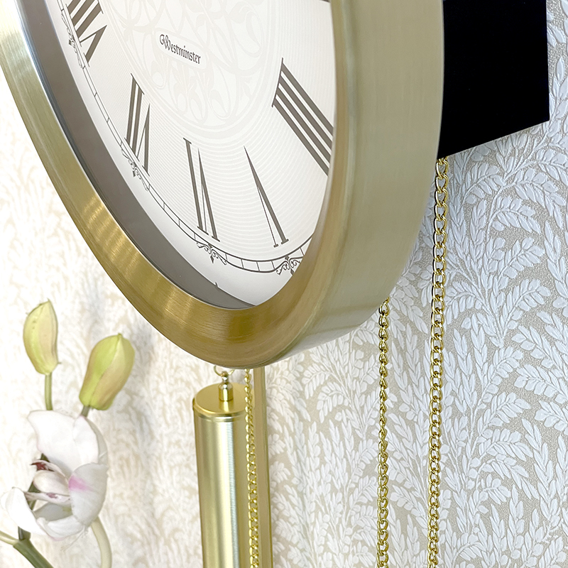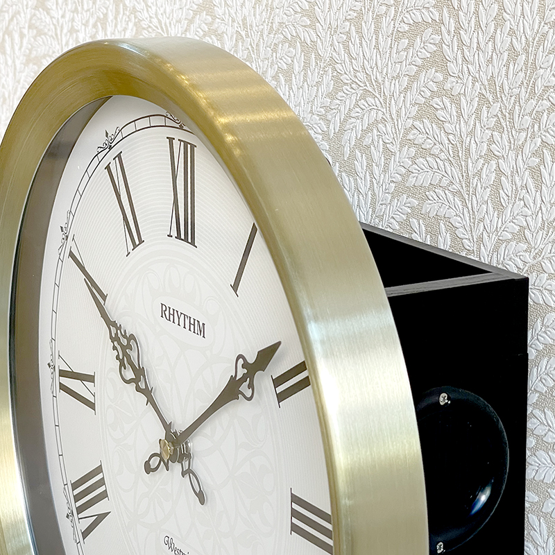 Mua tại TiktokĐồng hồ treo tường Nhật Bản Rhythm CMJ594NR18, dùng pin (AA x 4), vỏ nhôm mạ vàng, Kích thước 30.5 x 66.5 x 10.0cm , trọng lượng 1.18kg. Nhạc chuông nhà thờ Westminster 4 x 4 dạo nhạc ở vị trí 15 phút, 30 phút, 45 phút và gõ điểm giờ mỗi đầu giờ. Quả lắc mạ vàng.