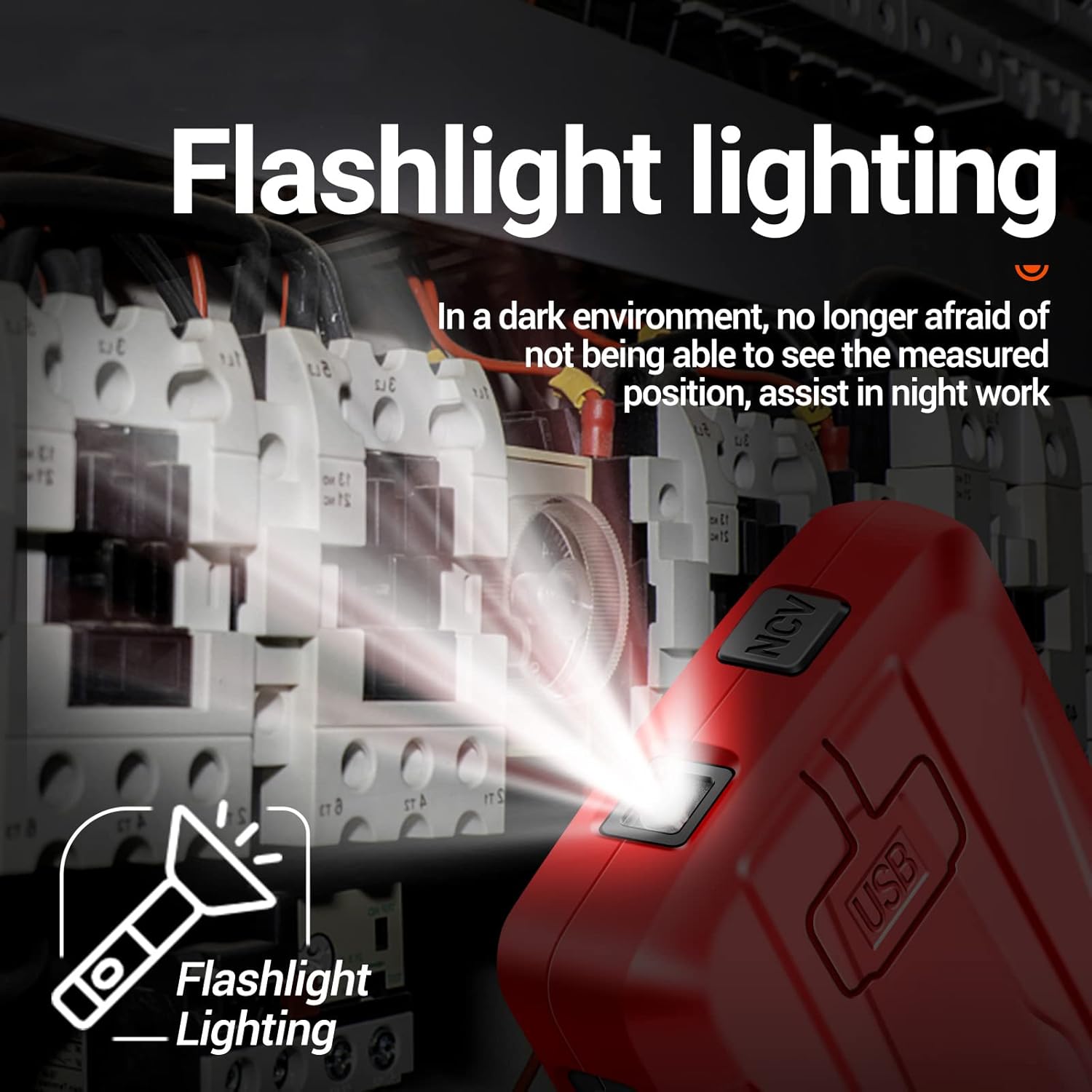 - Cảm biến không tiếp xúc NCV dễ dàng phát hiện nguồn có điện áp. Khoảng cách giữa máy với nguồn điện càng gần thì loa báo động càng khẩn cấp và đèn LED nền màu đỏ sẽ nhấp nháy