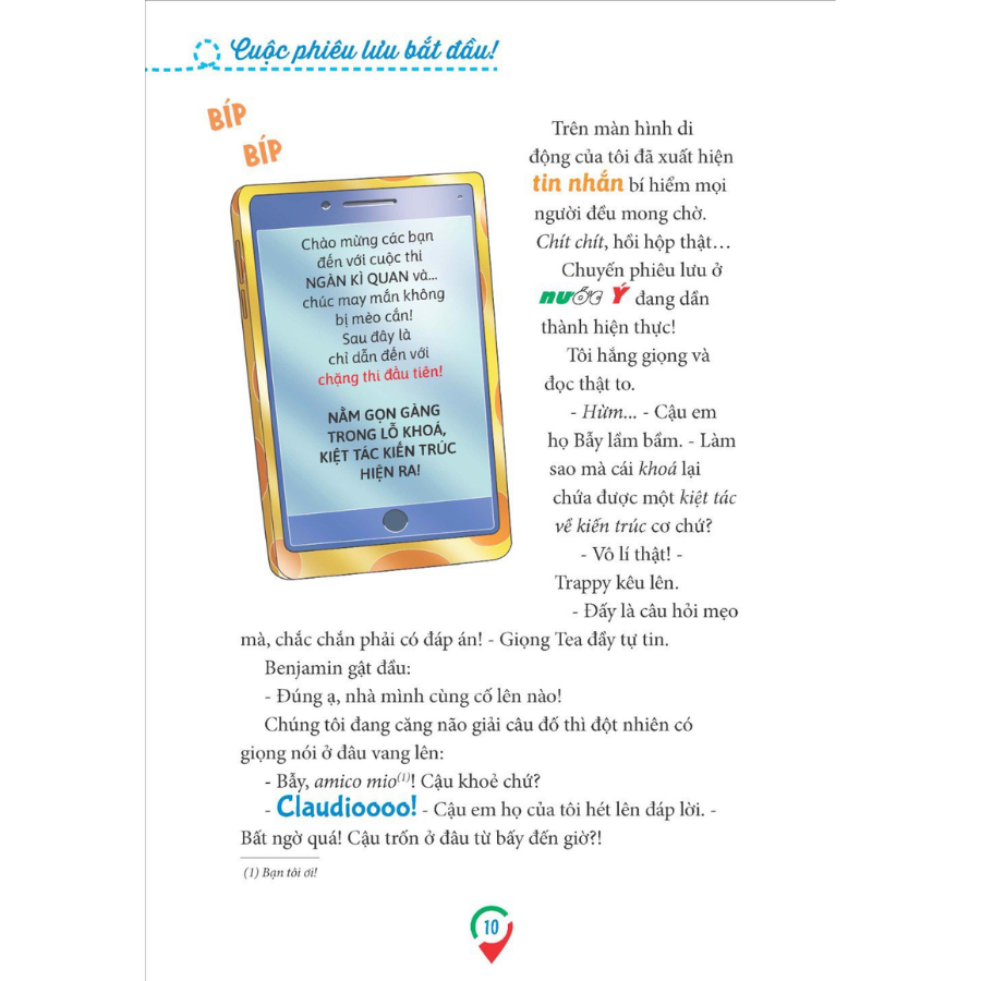 Các bạn đọc Gặm Nhấm thân mến, Hãy cài dây an toàn và chuẩn bị sẵn sàng nào: một chuyến đi tuyệt diệu đang chờ đón chúng ta. Lên đường cùng chúng tôi nhé! Đấy là một buổi sáng mùa hạ đẹp trời, tôi - Geronimo Stilton - đang ngồi trên máy bay, sẵn sàng cho một kì nghỉ thư thái với gia đình. Nhưng… đấy không hẳn là một kì nghỉ, mà còn là khởi đầu của một chuyến đi đáng nhớ vô cùng! Mời các bạn cùng tham gia vào chuyến phiêu lưu kì thú băng qua các vùng đất và tìm hiểu nền văn hoá của nước Ý: Một đất nước của NGÀN KÌ QUAN!