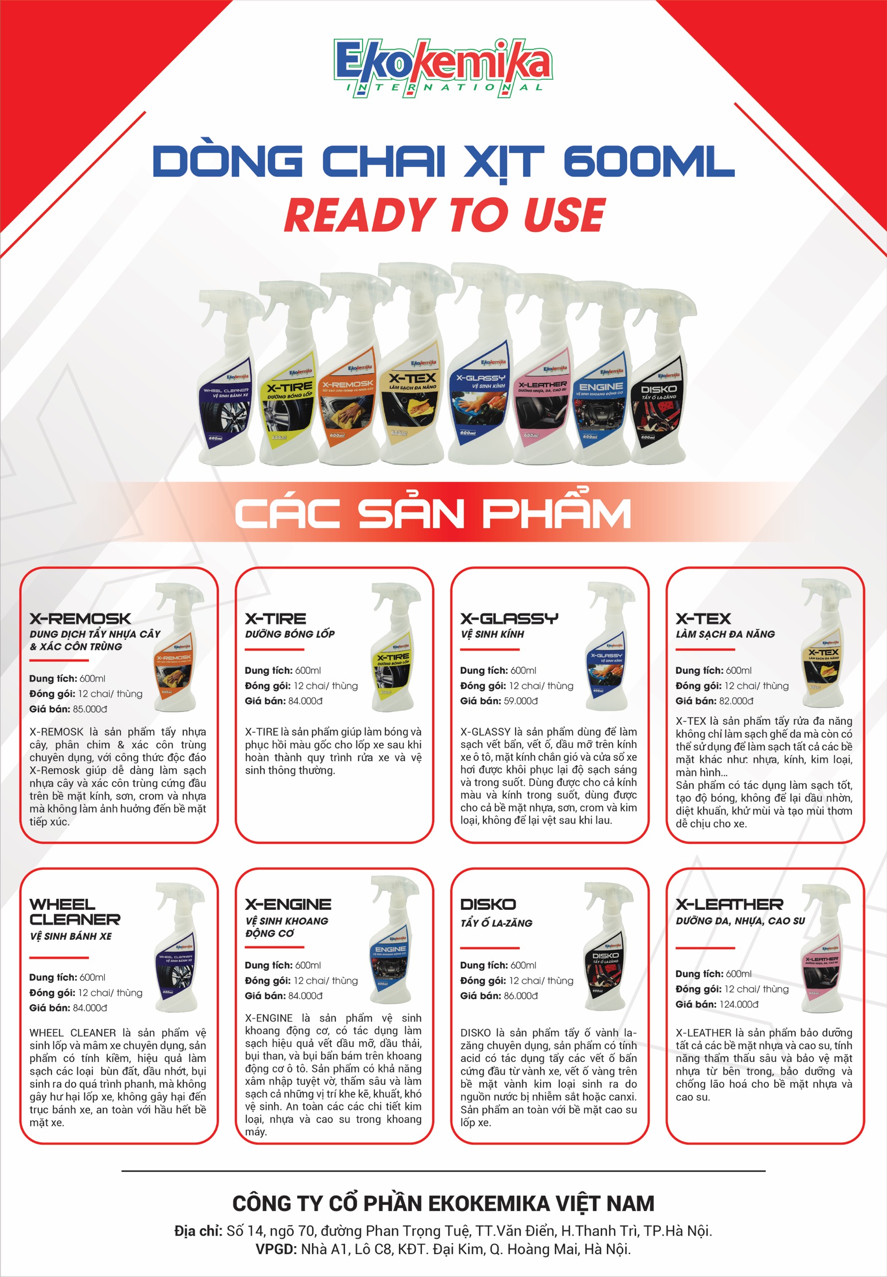 Mua tại TiktokDUNG DỊCH VỆ SINH BÁNH XE - LỐP XE EKOKEMIKA WHEEL CLEANER Dung tích: 600ml Đóng gói: 12 chai/ thùng Giá bán: 84.000₫/chai WHEEL CLEANER là sản phẩm vệ sinh lốp và mâm xe chuyên dụng, Dung dịch làm sạch lốp xe máy, ô tô bị ố vàng lâu ngày của thương hiệu nổi tiếng toàn cầu Ekokemika không chỉ là một sản phẩm thông thường mà còn là giải pháp hoàn hảo giúp bạn khôi phục vẻ đẹp tự nhiên của lốp xe và tăng cường sự an toàn khi lái xe.