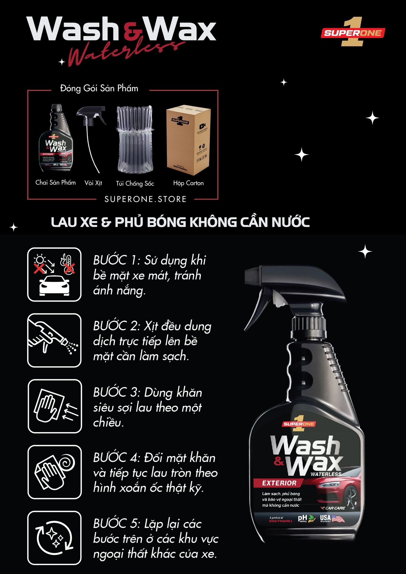 Mua tại TiktokLÀM SẠCH, PHỦ BÓNG VÀ BẢO VỆ NGOẠI THẤT MÀ KHÔNG CẦN NƯỚC Dung Dịch Lau Xe Và Phủ Bóng Ngoại Thất Không Cần Nước Super One Waterless Wash And Wax – Exterior nhẹ nhàng rửa sạch, tạo bóng và bảo vệ ngoại thất ô tô chỉ trong một bước dễ dàng. Sử dụng an toàn và hiệu quả gần như ở bất cứ bề mặt nào như sơn, nhựa, cao su, mạ crôm và kim loại. Công thức tiên tiến với lớp phủ bóng bề mặt xe, bảo vệ lâu dài hàng tuần. Sử dụng dễ dàng, nhanh chóng và không gây trầy xước hay mài mòn bề mặt vật liệu. Sản phẩm lý tưởng sử dụng cho các khu vực bị hạn chế tiếp cận nguồn nước như thành phố, căn hộ hoặc nước bị nhiễm phèn mặn. Đặc Tính Sản Phẩm