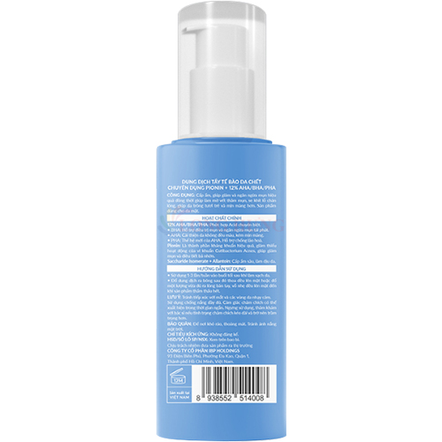 - Công dụng: Dung dịch tế bào chết chuyên dụng chứa đến 12% AHA/BHA/PHA, nay được bổ sung thêm Pionin - là thành phần kháng khuẩn, giảm thiểu hoạt động của vi khuẩn Cutibacterium Acnes, là giải pháp hữu hiệu giúp giảm và ngăn ngừa mụn hiệu quả đồng thời giúp làm mờ vết thâm mụn, se khít lỗ chân lông, giúp da trông tươi trẻ và mịn màng.