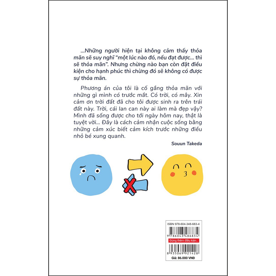 Cuốn sách Đừng thêm điều kiện cho hạnh phúc sẽ là cuốn sách giúp bạn cân bằng cảm xúc cá nhân, điều chỉnh các mối quan hệ đồng nghiệp, bạn bè, người thân để có thể an yên và hạnh phúc mỗi ngày.