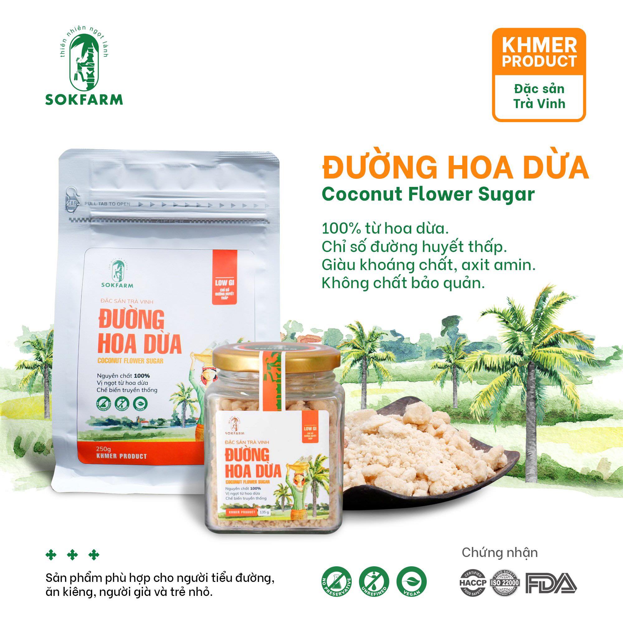 ĐƯỜNG HOA DỪA SOKFARM Đặc sản Trà Vinh   Những viên đường hoa dừa Sokfarm, được ví như viên ngọc thô kết tinh từ thiên nhiên. Đường hoa dừa được dùng để nhâm nhi khi uống trà, hay pha các loại trà hoa thì thật tuyệt. Đặc biệt đường hoa dừa phù hợp cho trẻ nhỏ ăn dặm. Trẻ nhỏ rất thích ăn đồ ngọt, hay ăn kẹo vì cơ thể và não của trẻ cần đường để phát triển. Nếu bạn đang cần một loại đường tốt cho trẻ thì mua ngay về cho bé nhé. Thành phần: 100% mật hoa dừa nguyên chất Kết tinh từ mật hoa dừa Sản phẩm đạt ISO22000, HACCP, FDA - xuất khẩu qua thị trường hoa kỳ Hạn sử dụng: 18 tháng Đường dừa là gì? Đường dừa (coconut sugar) là loại đường tự nhiên được làm từ nhựa cây dừa. Nó còn được gọi là đường cọ dừa, đường nhựa dừa hoặc đường hoa dừa. . Người dân châu Á, châu Phi và châu Mỹ đã biết cách làm đường từ cây dừa từ rất lâu. Trước tiên, để làm đường dừa, người ta dùng dao khứa lên hoa dừa để nhựa chảy ra vào thùng chứa. Loại nhựa này trong suốt và chứa khoảng 80% nước. Sau đó, nhựa được đun nóng cho đến khi nước bay hơi hết. Và sản phẩm cuối cùng còn lại chính là đường dừa. Đường dừa có vị ngọt dịu gần như đường nâu nhưng pha với một chút hương vị của caramel. Vì đường dừa không phải trả qua nhiều quá trình chế biến nên màu sắc, độ ngọt và hương vị có thể khác nhau tùy thuộc vào loại dừa cho nhựa, mùa thu hoạch hay cách chiết nhựa. Đường dừa có tốt không? Không như các sản phẩm khác từ cây dừa như nước dừa, cùi/cơm dừa hay tinh dầu dừa, đường dừa không hẳn là một siêu thực phẩm dinh dưỡng. Tuy nhiên, so với đường trắng, đường dừa lại cung cấp nhiều vitamin và khoáng chất hơn, bao gồm: Vitamin C, kali, phospho, magne, calci, kẽm, sắt và đồng. Một thìa cà phê đường dừa chỉ cung cấp 16 calorie. Đường dừa cũng cung cấp một lượng nhỏ dưỡng chất thực vật (phytonutrients), chẳng hạn như polyphenols, flavonoids, anthocyanidin và các chất chống oxy hoá khác. Trong đường dừa, bạn cũng sẽ tìm thấy vitamin B8 (inositol) - loại vitamin thường được sử dụng làm chất cải thiện tâm trạng. Đường dừa còn chứa inulin - chất xơ lành mạnh giúp làm chậm quá trình hấp thu đường glucose. Đây cũng chính là lý do vì sao đường dừa lại có chỉ số đường huyết (chỉ số GI) thấp hơn so với đường ăn thông thường. Như đã biết, fructose là một loại đường mà cơ thể có thể chuyển đổi thành mỡ một cách nhanh chóng. Chỉ có gan mới có khả năng phá vỡ fructose và sản sinh ra triglyceride - một dạng chất béo. Mật hoa Agave chứa tới 90% fructose, siro ngô fructose cao chứa 55% fructose. Trong khi đó, đường dừa chứa 70 - 79% sucrose, 3% glucose và 9% fructose. Như vậy, đường dừa được coi là sự lựa chọn tốt hơn nếu bạn đang tìm kiếm một loại đường hay chất làm ngọt thay thế đường granulated (tên gọi chung cho các loại đường sử dụng phổ biến hàng ngày). Bao bì sản phẩm thay đổi theo lô nhập