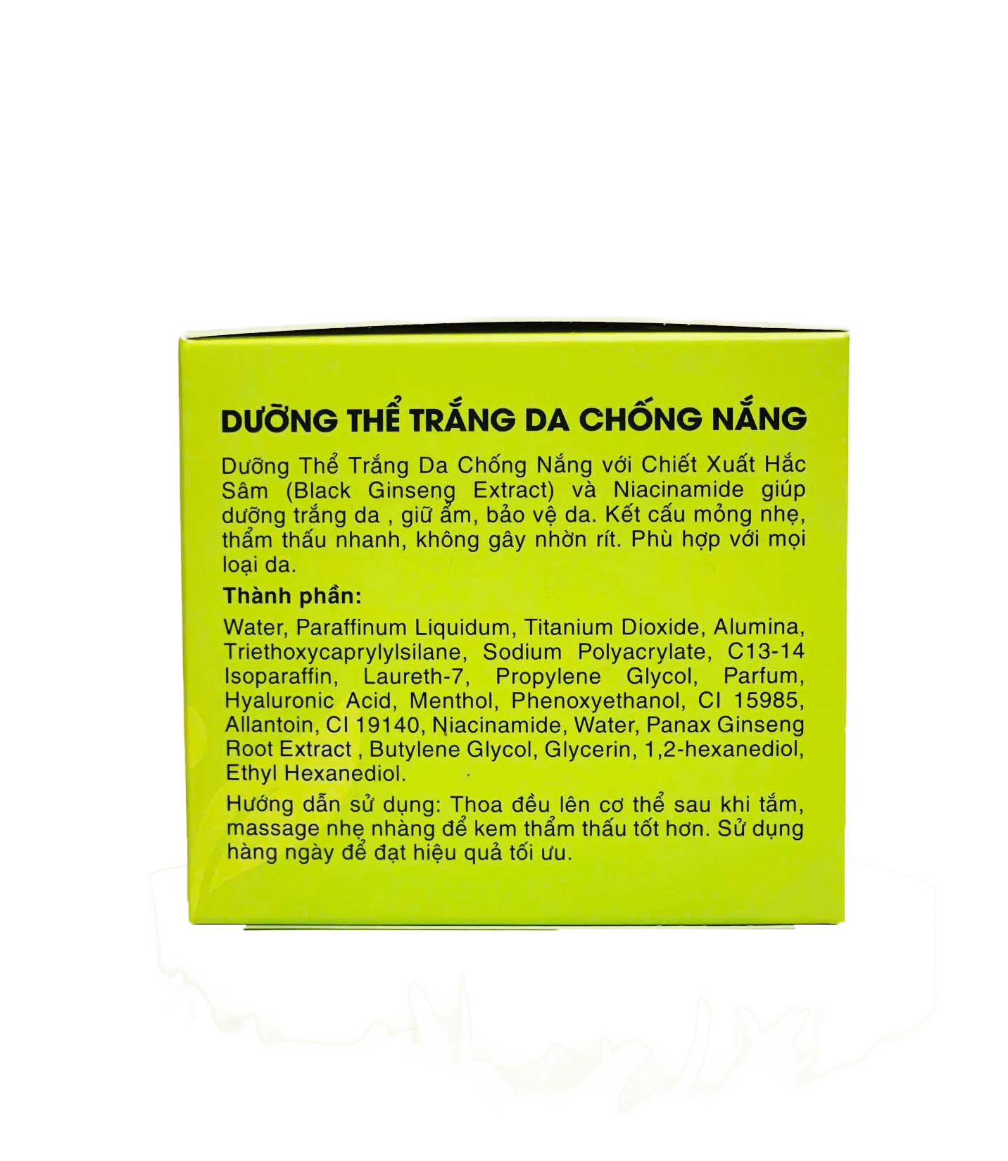 Dưỡng Thể Trắng Da Chống Nắng với Chiết Xuất Hắc Sâm (Black Ginseng Extract) và Niacinamide giúp dưỡng trắng da , giữ ẩm, bảo vệ da…