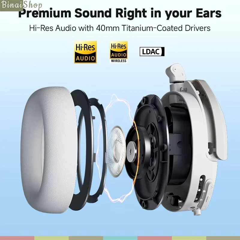 - Drive động 40mm với màng loa composite titan cho chất lượng âm thanh phong phú cho phép cảm nhận từng nốt nhạc.