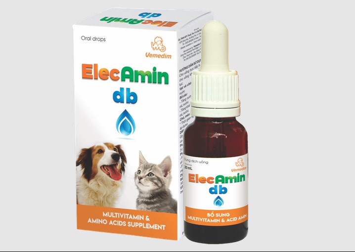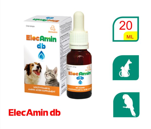 Vemedim ElecAmin db - Bổ sung Multivitamin & acid amin cho chó mèo, chim thú cảnh ElecAmin db THÀNH PHẦN: Trong 1 lít có chứa Vitamin A (min) 24 000 000 IU Vitamin D3